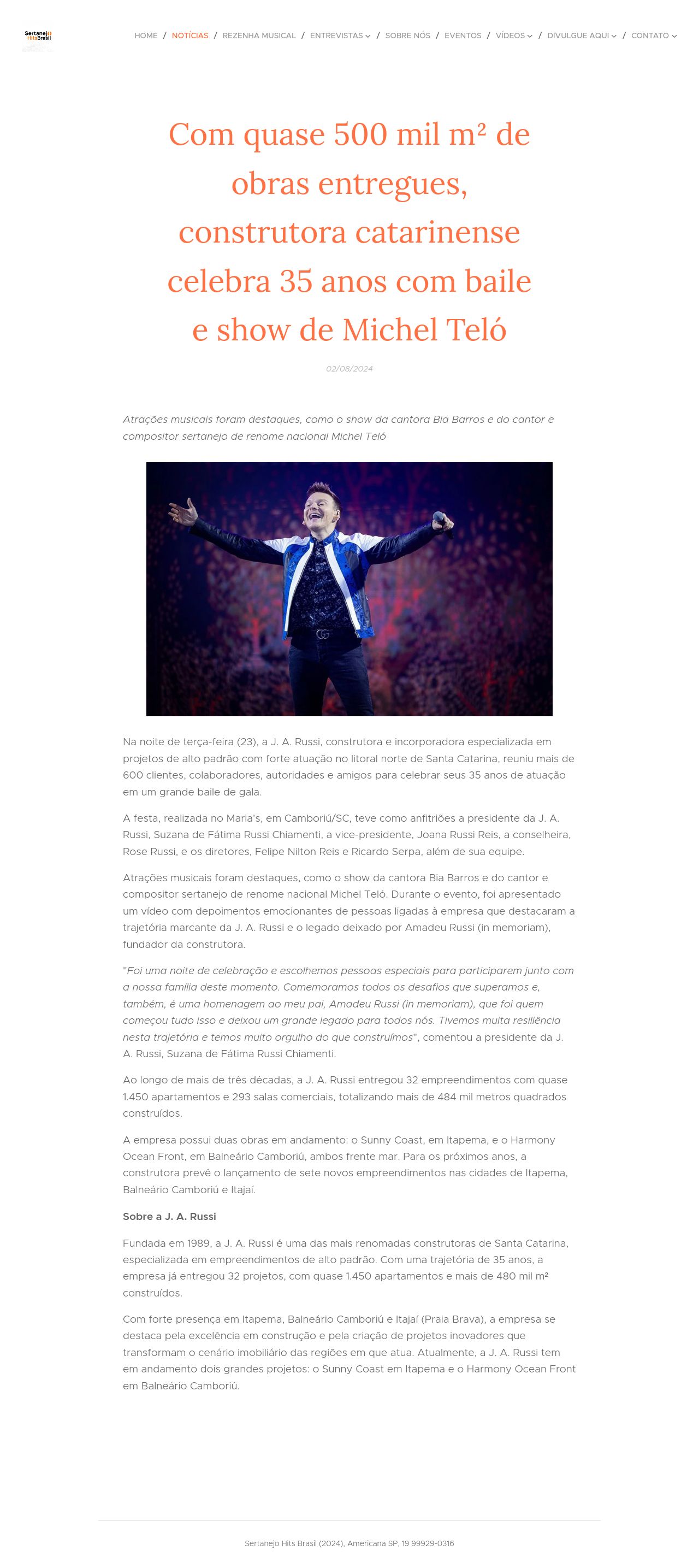 Com quase 500 mil m˛ de obras entregues, construtora catarinense celebra 35 anos com baile e show de Michel Teló :: Sertanejo Hits RMC