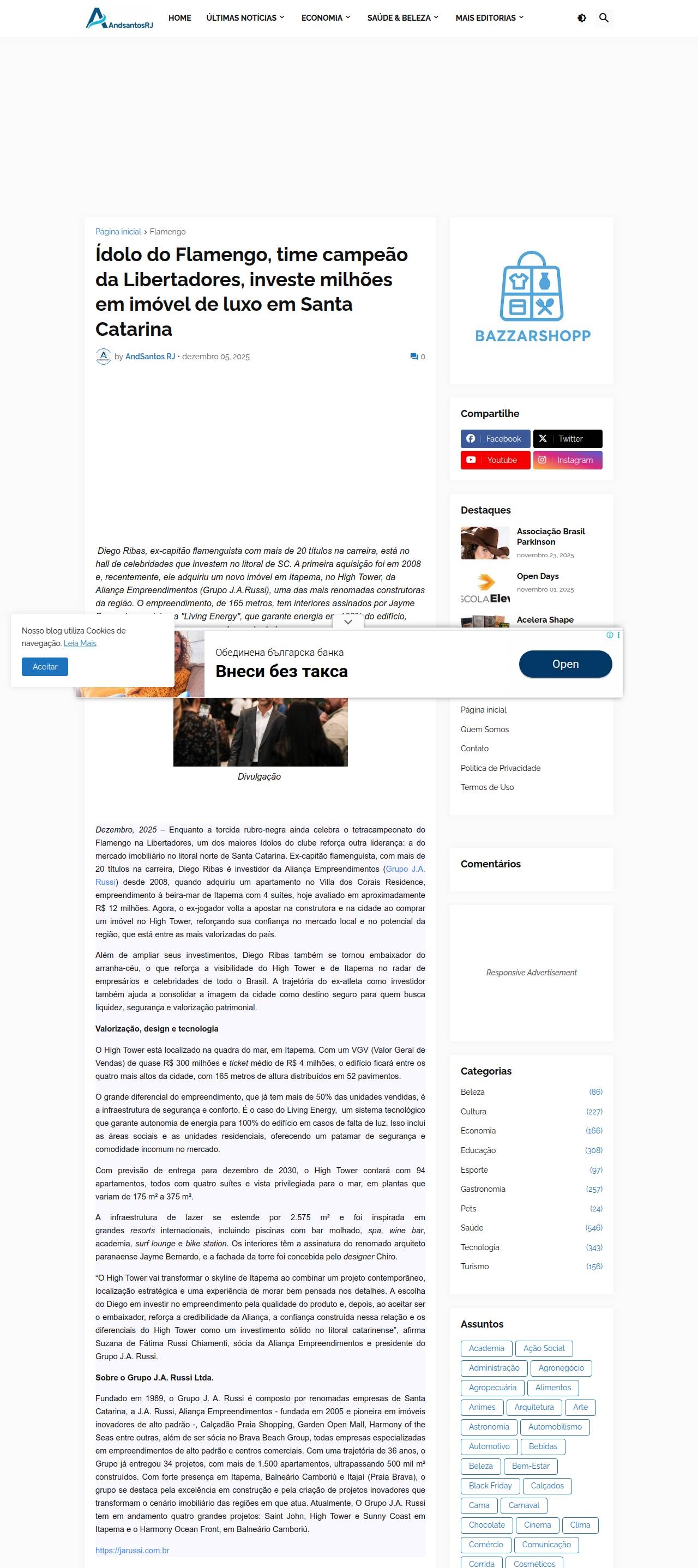 Ídolo do Flamengo, time campeão da Libertadores, investe milhões em imóvel de luxo em Santa Catarina