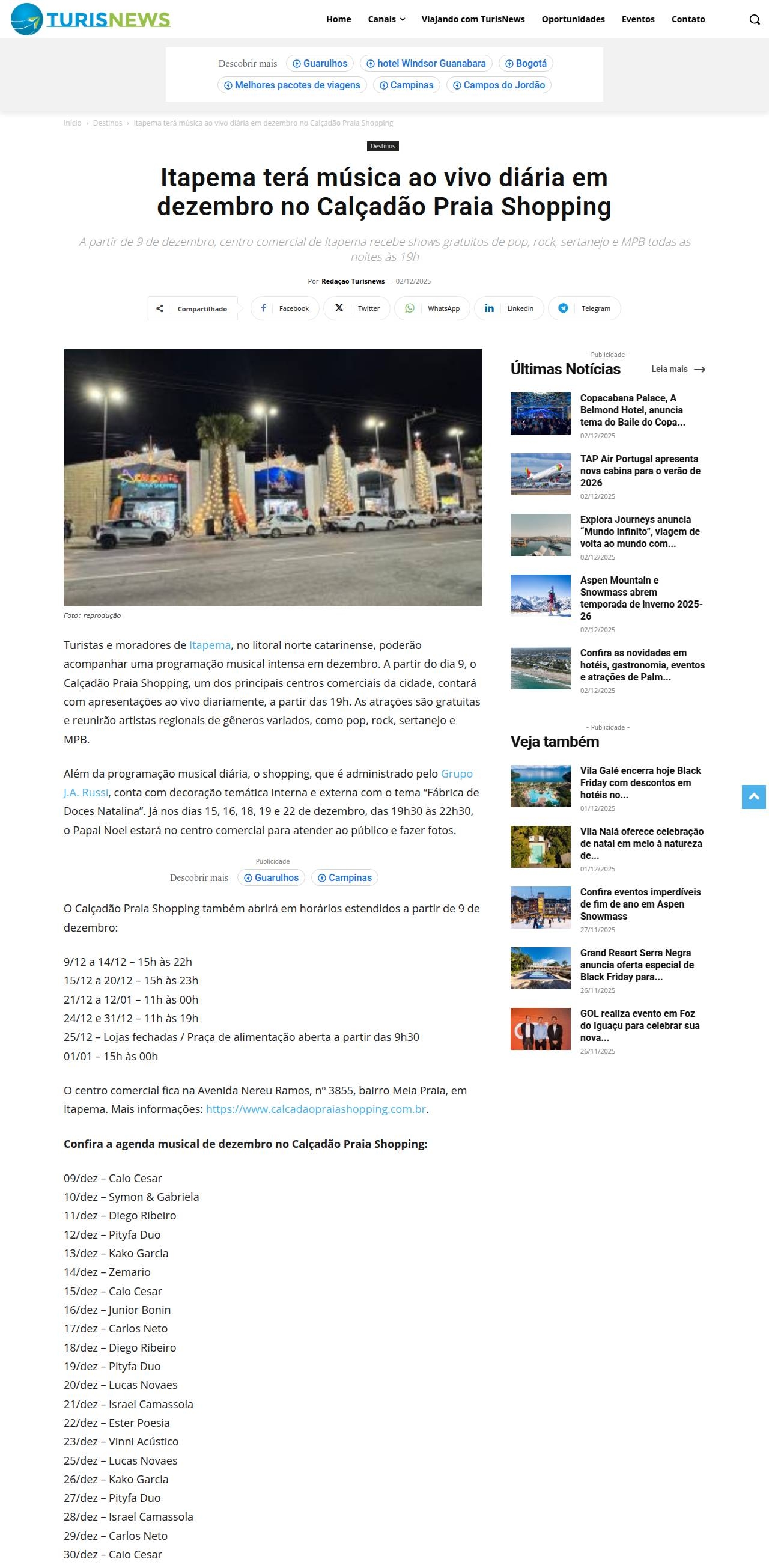 Itapema terá música ao vivo diária em dezembro no Calçadão Praia Shopping - Turismo