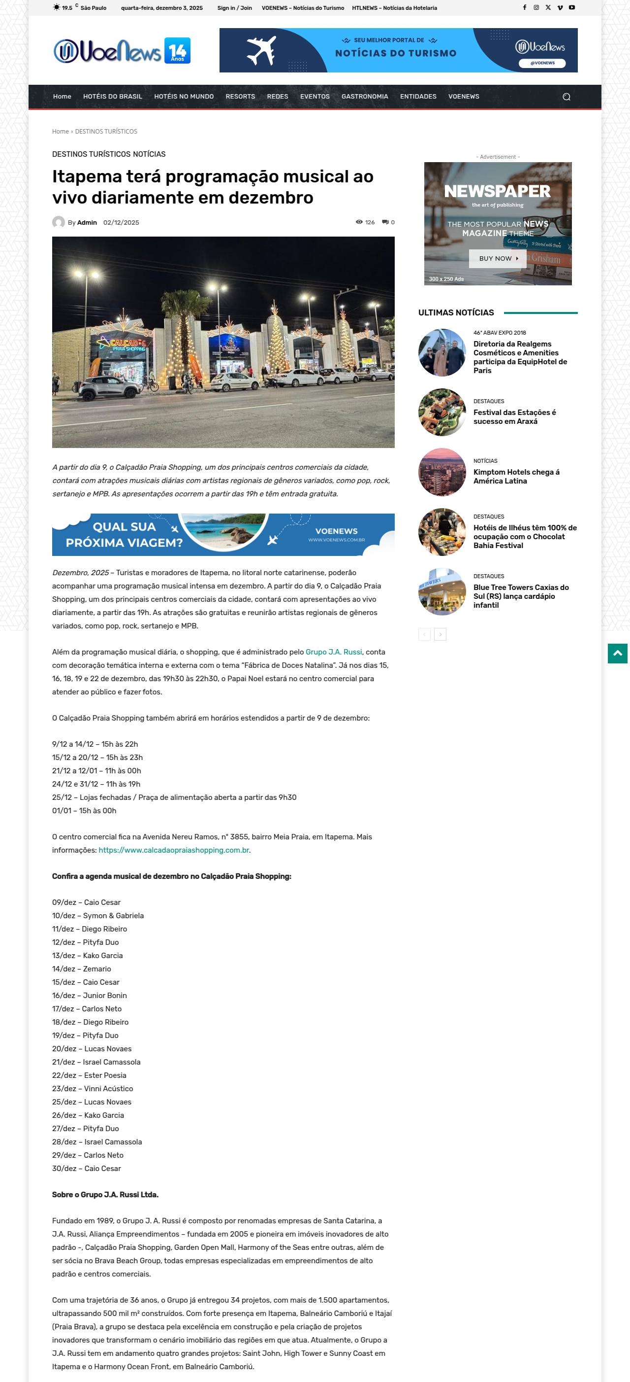 Itapema terá programação musical ao vivo diariamente em dezembro VOENEWS - Notícias do Turismo
