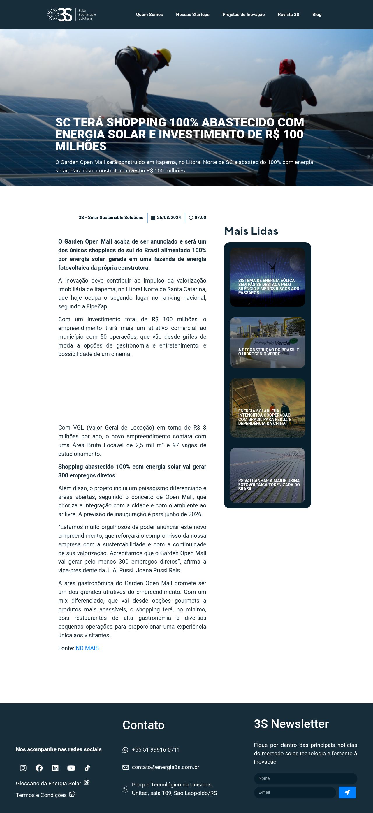 SC terá shopping 100% abastecido com energia solar e investimento de R$ 100 milhões - 3S