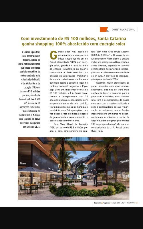 Shopping projetado em R$100 milhões será totalmente abastecido por energia solar